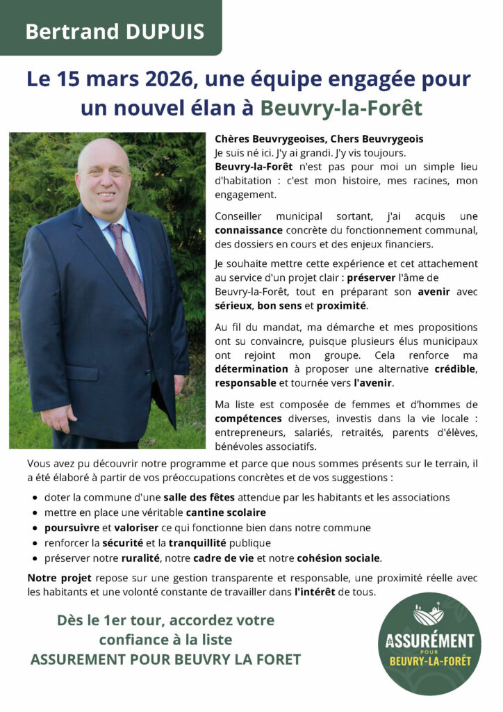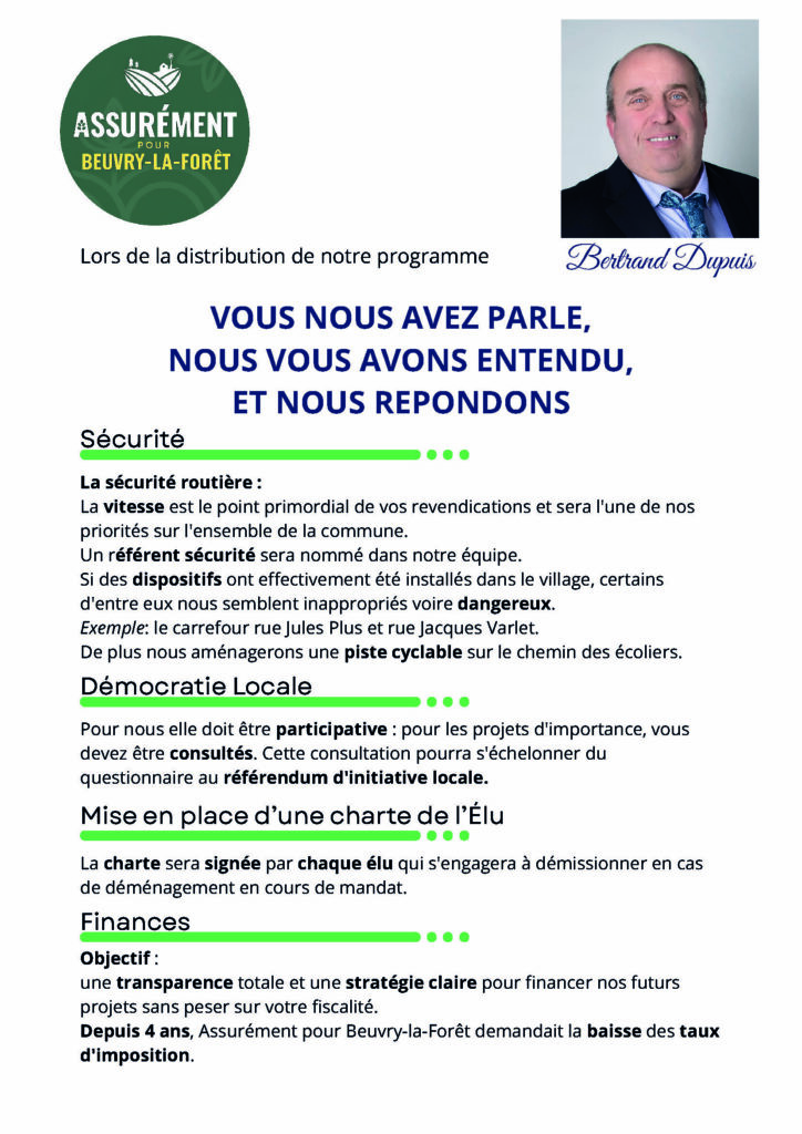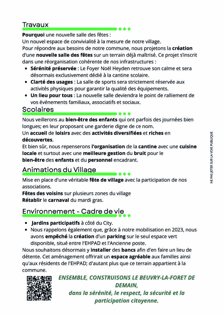 Programme & Profession de foi : Mise en page des engagements clés (sécurité, travaux, finances) pour une lecture claire et impactante.
