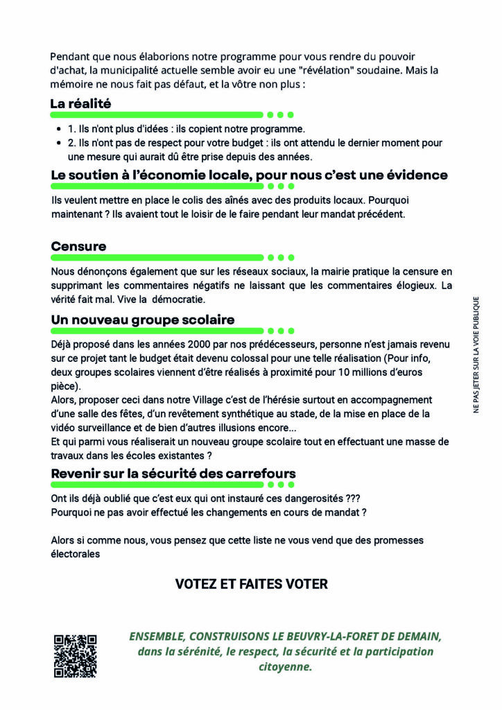 Flyers thématiques (« Tracts ») : Conception de supports de riposte et d’information pour répondre aux enjeux de la campagne (pouvoir d’achat, transparence, gestion communale).
